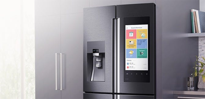 Na de woonkamer, slaapkamer en het kantoor, verschijnen er ook steeds meer slimme apparaten in onze keuken. Samsung toonde tijdens de CES wel een hele bijzondere 'slimme' koelkast: de Family Hub. Deze koelkast maakt, iedere keer als de deur gesloten wordt, foto's van de inhoud. Zodoende kan je via de bijbehorende app altijd zien wat er in je koelkast staat, wat het boodschappen doen natuurlijk een stuk makkelijker maakt. Daarnaast zit er ook een groot display op de deur, die het mogelijk maakt om online boodschappen te bestellen.