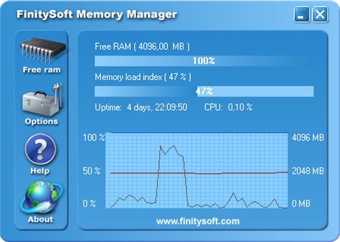 Heb je een recente computer met Windows 7 of Windows 8.1? Dan heb je weinig profijt van Memory Manager. Dit programma is bedoeld voor oude trage computers met weinig werkgeheugen. Het werkgeheugen wordt gebruikt door programma's. Soms komt het voor dat een programma te veel werkgeheugen claimt voor zichzelf of het niet teruggeeft aan Windows als het niet meer nodig is. In dit geval kan Memory Manager proberen het geheugen terug te halen. Klik op Free ram en vervolgens Free ram now. De instellingen zijn bereikbaar via Options. Hier kun je een drempel instellen waarbij Memory Manager automatisch moet ingrijpen om geheugen vrij te maken.