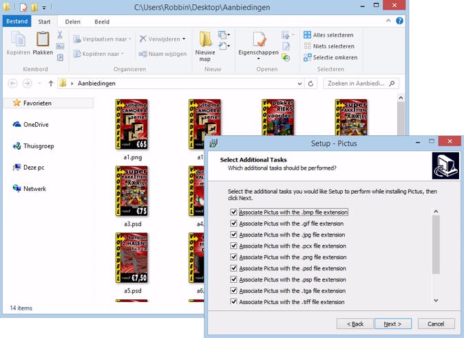 De Windows Verkenner toont van de meeste fotobestanden een miniatuurweergave. Dit is handig, omdat je je bestanden op deze manier kunt herkennen. Dit gaat sneller dan bestandsnamen lezen. Photoshop-bestanden worden niet getoond en dat is jammer als je je foto's bewerkt met dit populaire programma. Met Pictus image viewer krijg je dit wel voor elkaar. Deze freeware verzorgt miniatuurweergaven van bekende en minder bekende soorten fotobestanden, waaronder uiteraard psd. Maak tijdens de installatie de keuze van welke fotobestanden Pictus image viewer de miniatuurweergave moet tonen.