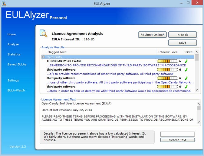 Er is een betaalde pro-versie van EULAlyzer met meer mogelijkheden, maar de gratis versie doet uitstekend dienst om snel interessante onderdelen uit een EULA naar boven te halen.