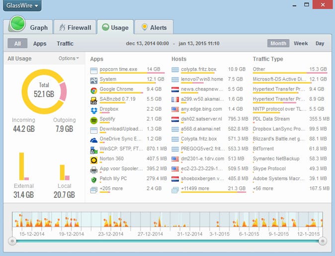 Heb je enig idee welke programma's op je computer verbinding maken met internet? Een virusscanner die zichzelf bijwerkt, Dropbox en misschien Microsoft Office tijdens het installeren. Welk getal je ook roept, de kans is groot dat je er ver naast zit. Er zijn namelijk misschien maar een paar programma's op je computer die niet regelmatig verbinding maken. GlassWire brengt dit keurig in kaart en toont welke programma's er verbinding maken en met welke server. Ook zie je hoeveel dataverkeer er wordt verbruikt. Je kunt totalen bekijken of deze informatie specifiek per programma opvragen. Zo zie je eenvoudig achterhalen wat bijvoorbeeld een avondje series kijken met Netflix of Popcorn Time aan dataverkeer verbruikt.
