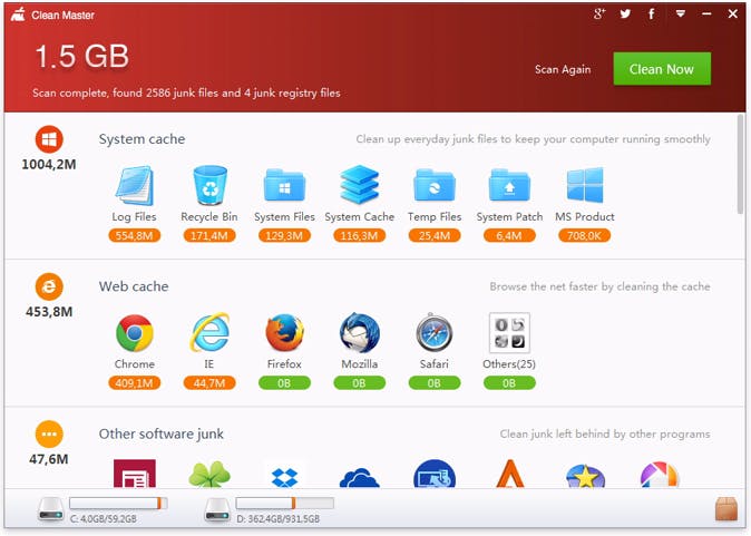 Bijna iedereen is inmiddels bekend met het schoonmaakprogramma CCleaner, dus meer dan dit programma noemen doen we niet. Clean Master is minder bekend en een uitstekende aanvulling op CCleaner. Clean Master is vooral goed in het opsporen van overbodige bestanden van programma's. Uiteraard zijn alle standaard schoonmaakroutines ook aanwezig om tijdelijke/overbodige bestanden van onder andere je browser te verwijderen. Volgens de makers maak je met Clean Master gemiddeld 2 GB aan schijfruimte vrij. Dit komt aardig in de buurt van onze bevindingen. De eerste keer als je Clean Master gebruikt, zal je schoonmaakactie zelfs nog veel meer ruimte opleveren.