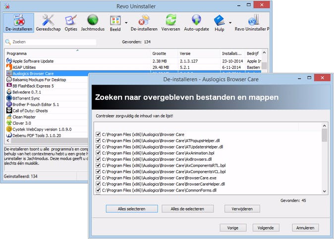 Als je programma's verwijdert via de standaard de-installatieprocedure van Windows, blijven er vaak resten achter op je computer. Soms is dit slordigheid van de programmeur, maar soms wordt er ook vanuit gegaan dat je een programma ooit opnieuw wilt installeren. In dat geval worden er bijvoorbeeld ongevraagd instellingen bewaard. Revo Uninstaller Free biedt uitkomst en helpt bij het grondig verwijderen van programma's. Revo Uninstaller Free activeert eerst de standaard de-installatieprocedure. Vervolgens wordt er gecontroleerd op achtergebleven resten en kun je ook die laten verwijderen.