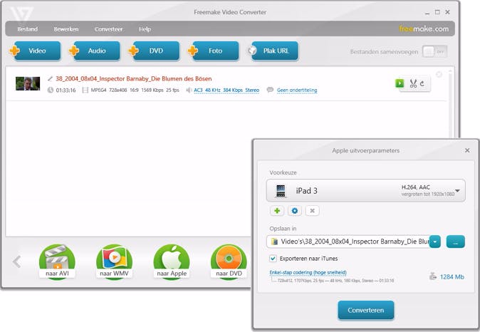 Er zijn veel oplossingen om videobestanden om te zetten naar een ander formaat, maar geen enkele oplossing werkt zo eenvoudig en soepel als die van Freemake Video Converter. Freemake Video Converter kan alle gangbare formaten aan en regelt het omzetten naar een andere indeling binnen een paar muisklikken. Je hoeft geen verstand te hebben van videobestanden of formaten. Sleep je videobestand naar het Freemake Video Converter-venster en geef aan naar welk formaat je wilt exporteren. Je kunt zelfs het apparaat kiezen, bijvoorbeeld Naar Apple / iPad 3.