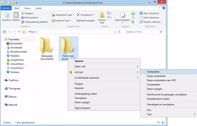 Als je bestanden onleesbaar wilt maken voor derden, kun je gebruikmaken van encryptie. AxCrypt maakt het eenvoudig om dit toe te passen op een of meerdere bestanden. Het programma integreert in de Windows Verkenner. Klik met de rechtermuisnop op een bestand, kies voor AxCrypt / Versleutelen en geef een goed wachtwoord op. Het bestand wordt beveiligd. Gebruik de rechtermuisknop opnieuw en kies AxCrypt / Ontsleutelen om de beveiliging ongedaan te maken. Na het opgeven van het juiste wachtwoord is het bestand weer toegankelijk. Je kunt AxCrypt ook toepassen op een map of selectie bestanden.