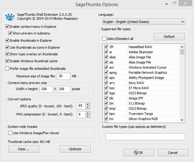 In de Windows Verkenner zie je bij veel bestanden een miniatuurweergave. Het handige hieraan is dat je snel aan de hand van de afbeelding een foto terug kunt vinden. Bij sommige bestandsformaten wordt de miniatuurweergave echter niet getoond. Dankzij SageThumbs krijg je dit wel voor elkaar. Het programma ondersteunt meer dan 150 (!) grafische formaten. Zo wordt er zelfs van Photoshop-bestanden (psd) een miniatuurweergave getoond. Daarnaast kan SageThumbs je afbeeldingen ook omzetten naar een ander formaat, bijvoorbeeld van png naar jpg. Klik met de rechtermuisknop in de Windows Verkenner op een of meerdere afbeeldingen en kies SageThumbs / Convert to jpg (of een andere indeling).