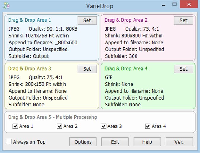 Als je regelmatig foto's verkleint of om wilt zetten naar een ander formaat, is VarieDrop een handig programma. VarieDrop heeft vier zones. Per zone kun je fotobewerkingen instellen, bijvoorbeeld opslaan als jpg met een kwaliteit van 90% en een maximale resolutie van 1200x900. Je kunt ook een doelmap instellen per zone, bijvoorbeeld een tijdelijke map op je bureaublad. Sleep foto's via de Windows Verkenner naar een van je VarieDrop-zones en het programma voert de voorgedefinieerde bewerkingen uit. VarieDrop is zeer geschikt als je bijvoorbeeld foto's wilt verkleinen voor mailgebruik of marktplaatsadvertenties. Ook als je regelmatig een website bijwerkt met nieuwe foto's is VarieDrop handig. Door de foto's al op je computer te verkleinen, gaat het uploaden naar de website veel sneller.