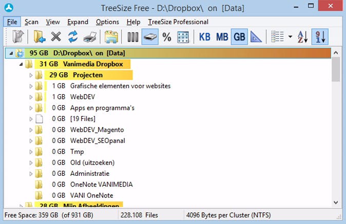 Tip 19 TreeSize Free laat zien welk mappen veel schijfruimte in beslag nemen.