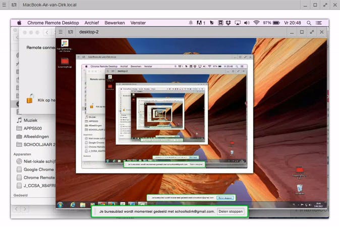 Tweerichtingsverkeer met Chrome Remote Desktop is mogelijk, maar het resultaat is behoorlijk verwarrend. Het lukt wel om in tegelijk elkaars bureaublad te zien, maar op het extern bureaublad staat ook jouw bureaublad met daarin het extern bureaublad, en ga zo maar door tot in het oneindige. Hierdoor krijg je een Droste-effect dat je kunt vergelijken met wat je te zien krijgt wanneer je twee spiegels tegenover elkaar houdt. Je kunt dat oplossen als één van beide partijen Chrome Remote Desktop minimaliseert of verbergt.