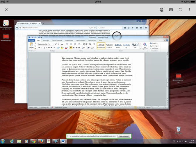 In iOS of Android log je eerst in met je Gmail-adres. Je zult merken dat Google je dan in de achtergrond een e-mailbericht stuurt om te waarschuwen dat een nieuw apparaat is ingelogd met je Gmail-account. Daarna herken je de geactiveerde computers in de lijst Mijn computers. Vervolgens verschijnt het venster Verifiëren naar host waar je de pincode ingeeft van de externe computer en daarna druk je op Verbinding maken met computer. Waarschijnlijk is het externe bureaublad te groot voor het scherm van je mobieltje of je tablet, dat los je op door met drie vingers te knijpen op het scherm van je mobiele apparaat. Chrome Remote Desktop ondersteunt immers pinch-to-zoom zodat je onderdelen groter en kleiner kunt maken op een klein scherm.