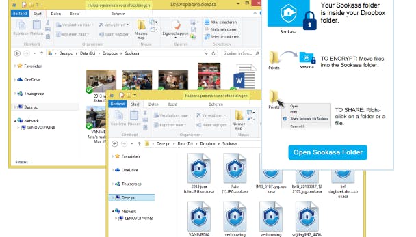 Alles wat je bewaart in de Sookasa-map van je Dropbox, wordt door Sookasa automatisch beveiligd met encryptie.