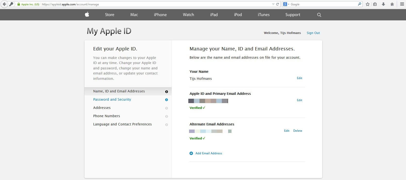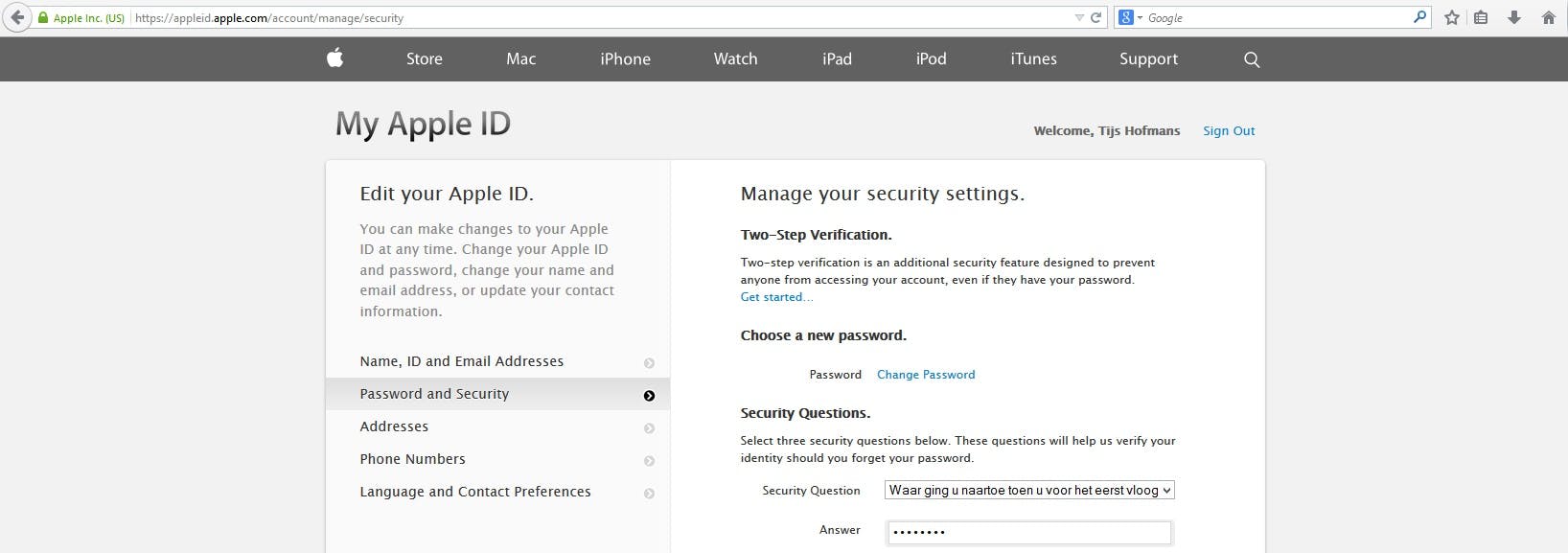 Als je ingelogd bent, kom je bij My Apple ID uit, waar je allerlei informatie over je account kunt inzien en wijzigen. Klik hier links op 'Password and Security' ('Wachtwoord en Beveiliging' in het Nederlands).