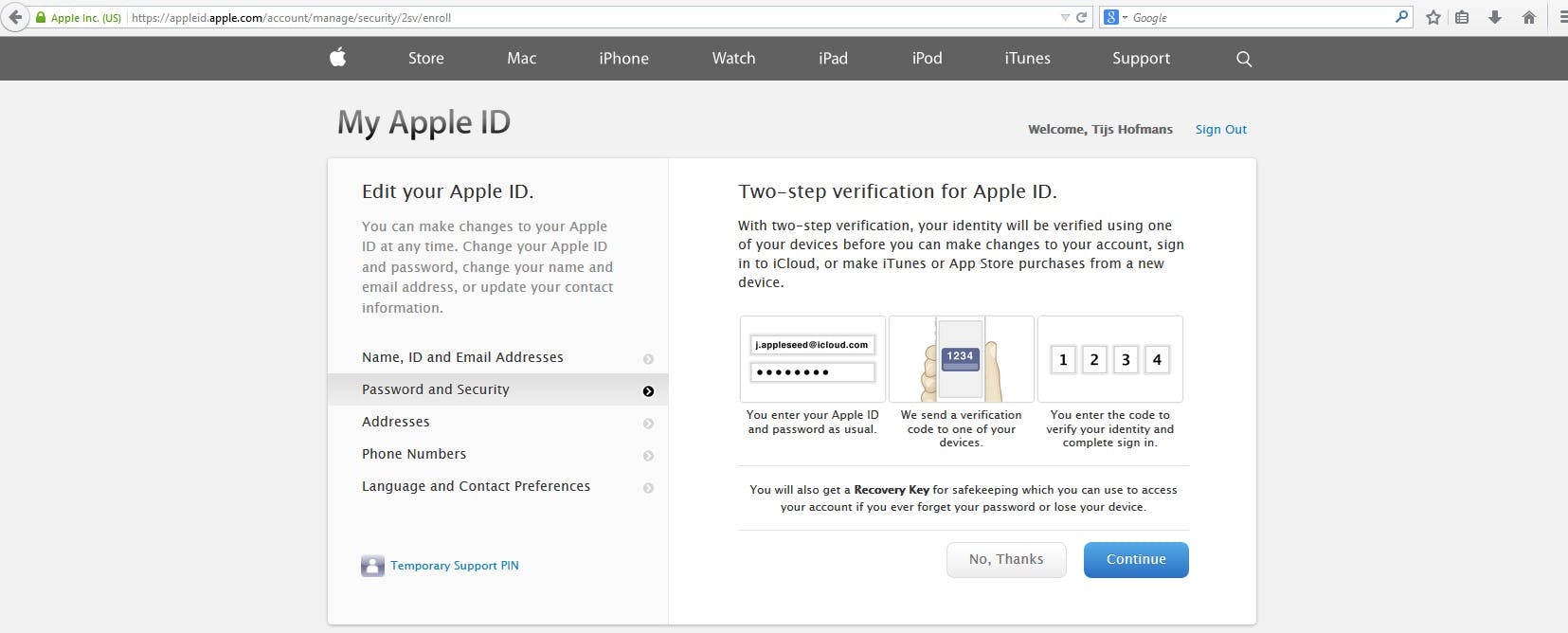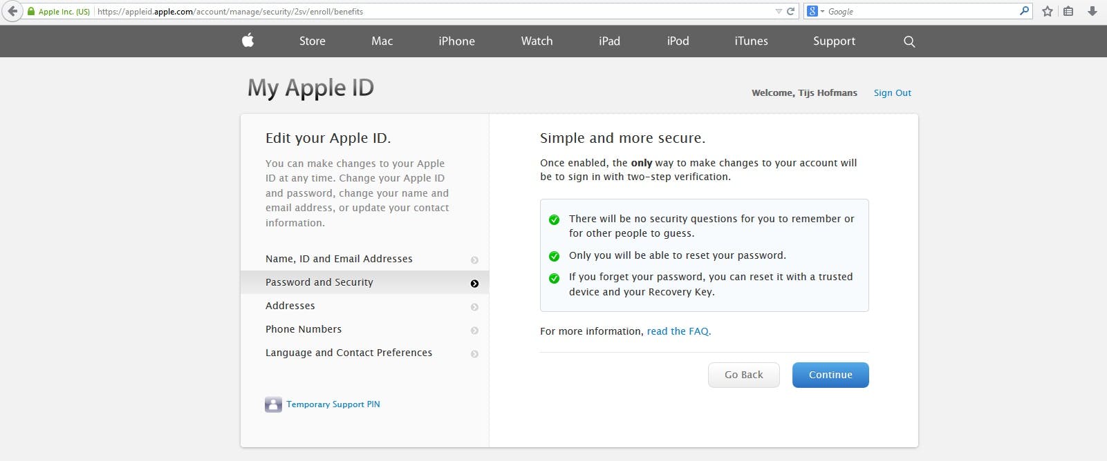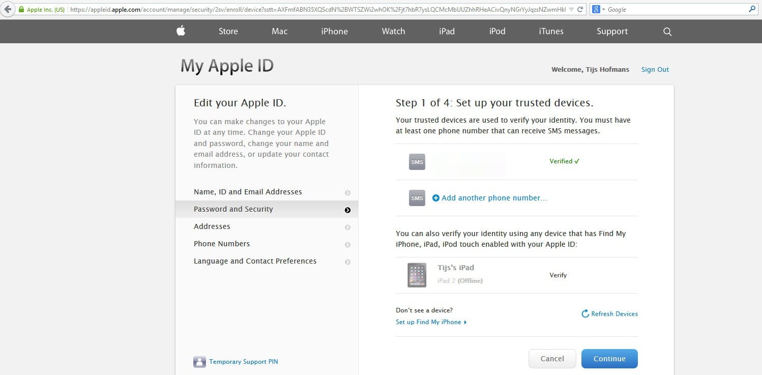 In dit scherm krijg je wat uitleg over wat tweestapsverificatie precies inhoudt. Je leest hoe je een ander apparaat kunt gebruiken om veilig in te loggen. Als je dit gelezen hebt (of niet...) klik je op 'Continue'