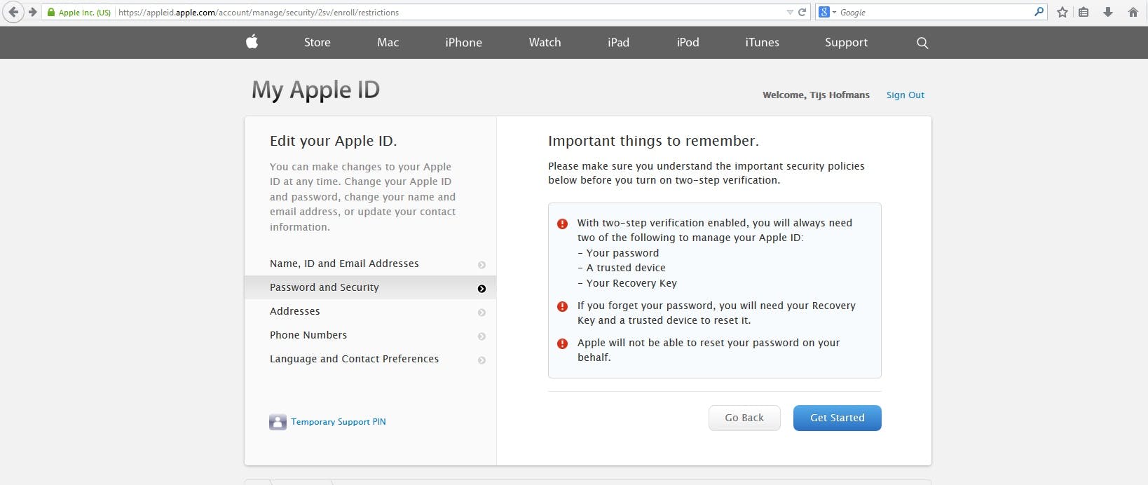 Als je deze vragen hebt ingevuld, kom je uit op het scherm waar je tweestapsverificatie kunt aanzetten. Je ziet dat bovenaan staan. Klik op 'Get started'.