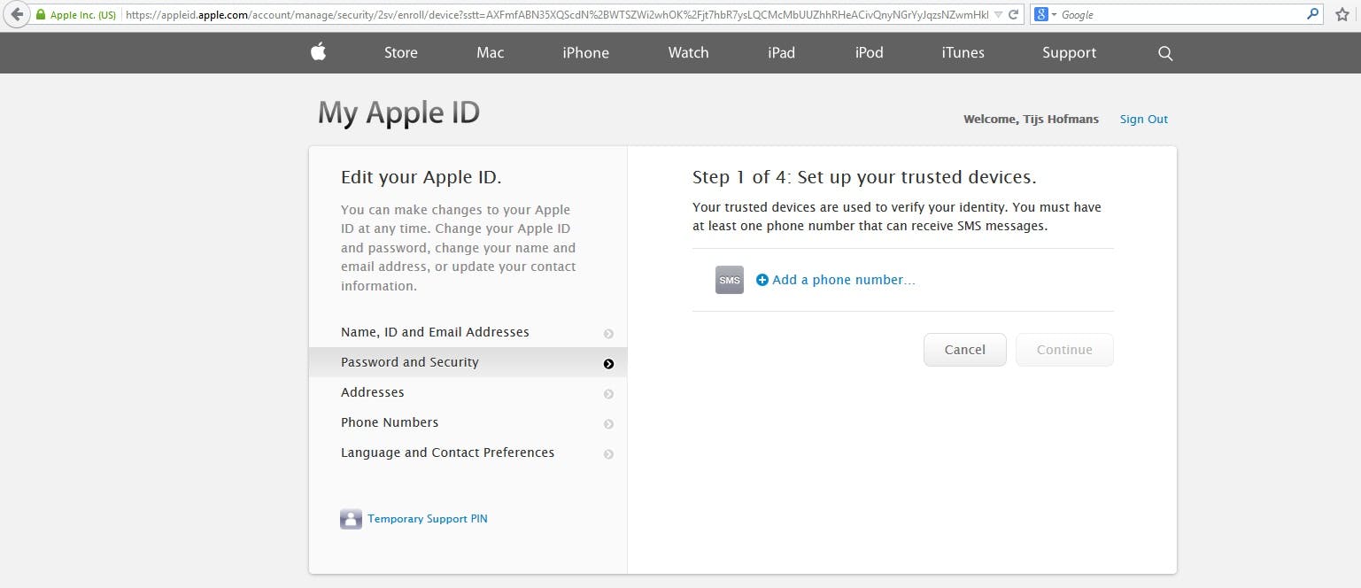 Nu kun je eindelijk beginnen je tweestapsverificatie aan te zetten. Stap is om je telefoonnummer toe te voegen. Klik daarom op 'Add a phone number'.