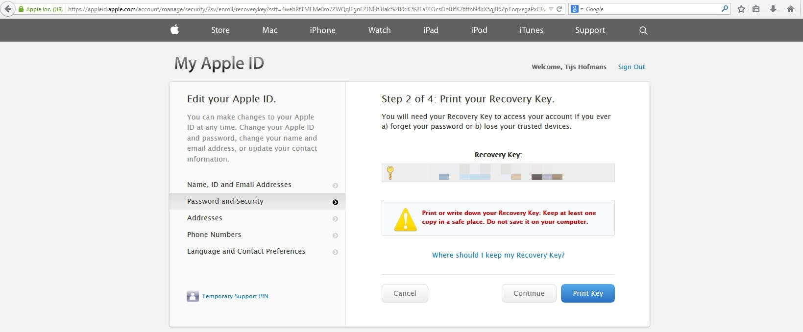Dit is belangrijk: je krijgt een unieke 'Recovery key'. Die bestaat uit 14 letters, en je hebt die code nodig als bijvoorbeeld je telefoon wordt gestolen en je geen toegang hebt tot je iPhone-account. Het is dus belangrijk dat je deze code niet kwijtraakt. Sla 'em dus op in LastPass of 1Password, of bewaar het ergens anders op een veilige plek. Of leer het uit je hoofd. Als je op 'Where should I keep my Recovery Key?' klikt, krijg je van Apple een aantal tips over waar je het wachtwoord het veiligst kan opslaan. Als je dit gedaan hebt, klik dan op 'Continue'.