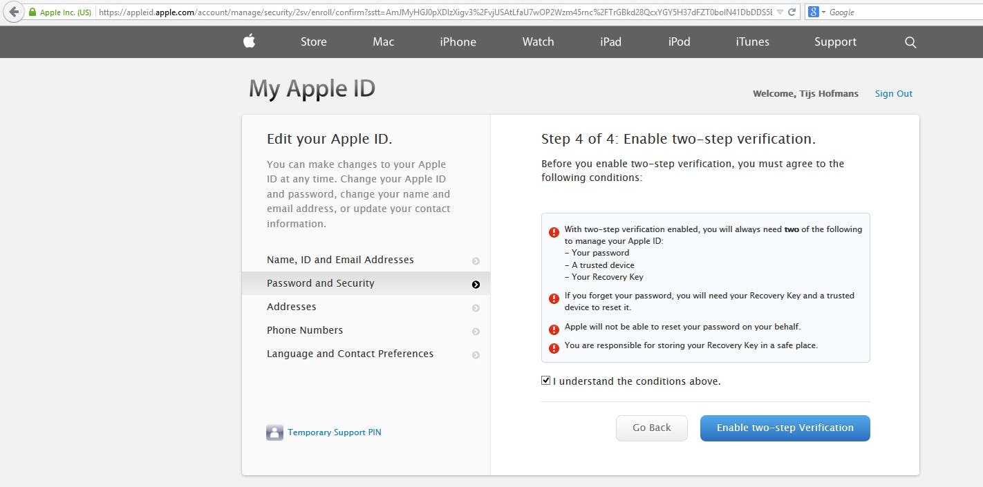 De laatste stap is om alles te verifiëren. Je krijgt hier nog een laatste waarschuwing dat je je telefoon toch vooral niet kwijt moet raken als je nog wilt inloggen op iCloud of apps wil kopen, en hoe je dat kunt voorkomen. Geef bij het vakje eronder aan dat je alles begrijpt en klik op 'Enable two-step Verification'