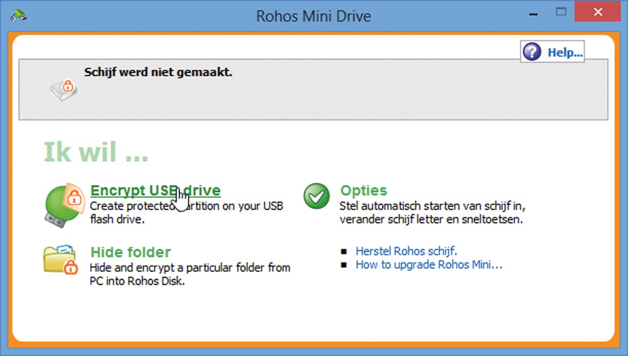 Na de installatie start Mini Drive automatisch, mocht dat even niet het geval zijn dan is er de snelkoppeling. De software is Nederlandstalig, maar niet alle onderdelen zijn omgezet. Om een versleutelde partitie (eigenlijk een ‘containerbestand’ met daarin al uw versleutelde bestanden) te maken klikt u in het hoofdvenster op Encrypt USB drive (zie afbeelding).