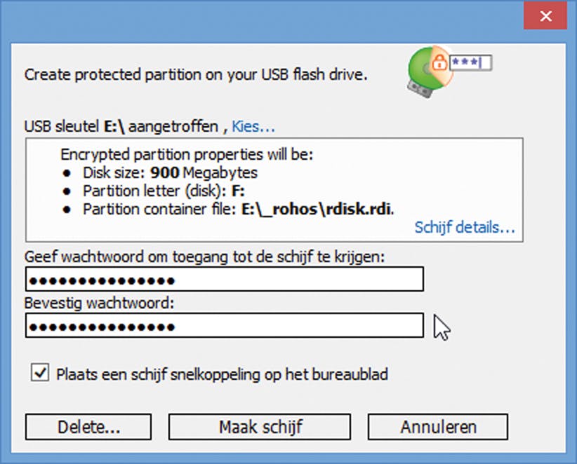 Plaats de usb-stick (in de software USB sleutel genoemd) en geef na automatische detectie een goed wachtwoord op. Dat bestaat liefst uit een combinatie van letters, cijfers en ‘gekke’ tekens. Hoe moeilijker het wachtwoord, hoe veiliger uw gegevens. Klik op Maak schijf en wacht even. Hoe lang u dient te wachten hangt van de grootte van uw stick af, Rohos kan ‘partities’ van maximaal 2 GB maken, de rest van de onversleutelde ruimte blijft gewoon bruikbaar als vanouds (zie afbeelding).