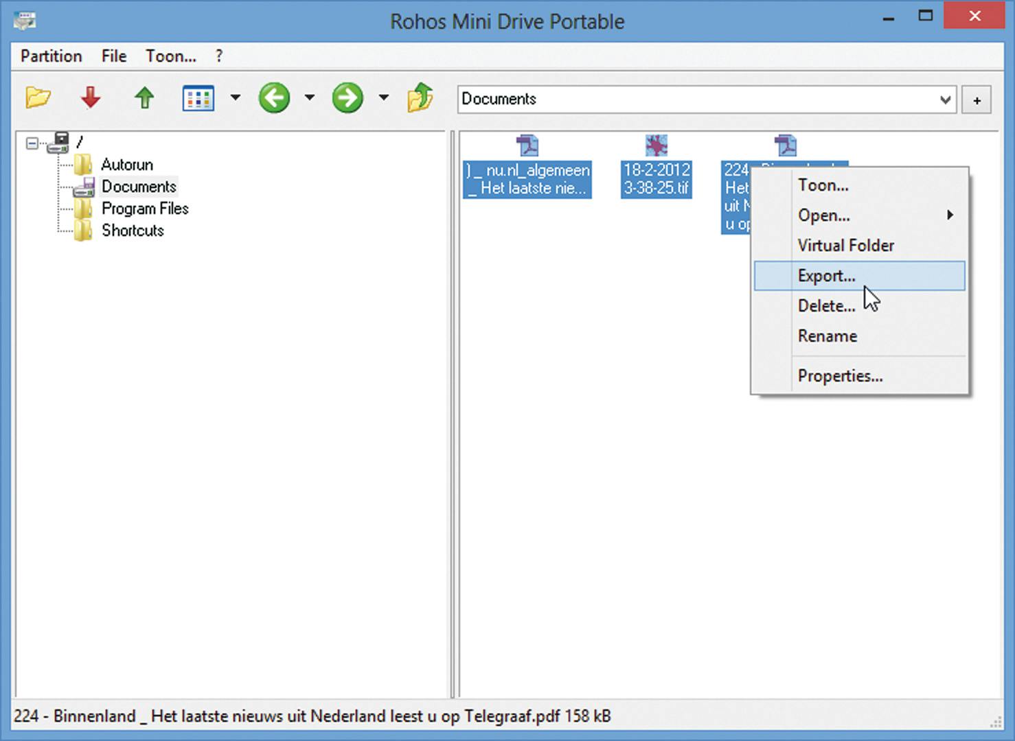 U ziet nu direct de inhoud van uw versleutelde partitie en bestanden zijn eenvoudig van de Windows Verkenner naar deze software te slepen. Standaard is al een aantal mappen beschikbaar, gebruik bijvoorbeeld Documents voor uw documenten die niet iedereen onder ogen mag krijgen. Om bestanden van de stick naar uw pc over te hevelen, selecteert u de gewenste bestanden. Klik met de rechtermuisknop op de selectie en in het contextmenu op Export. Kies tot slot een map waarheen de bestanden gekopieerd moeten worden. Dat lijkt wat omslachtiger dan slepen, maar voorkomt dat u gedachteloos gevoelige documenten achterlaat op bijvoorbeeld uw werk-pc (zie afbeelding).