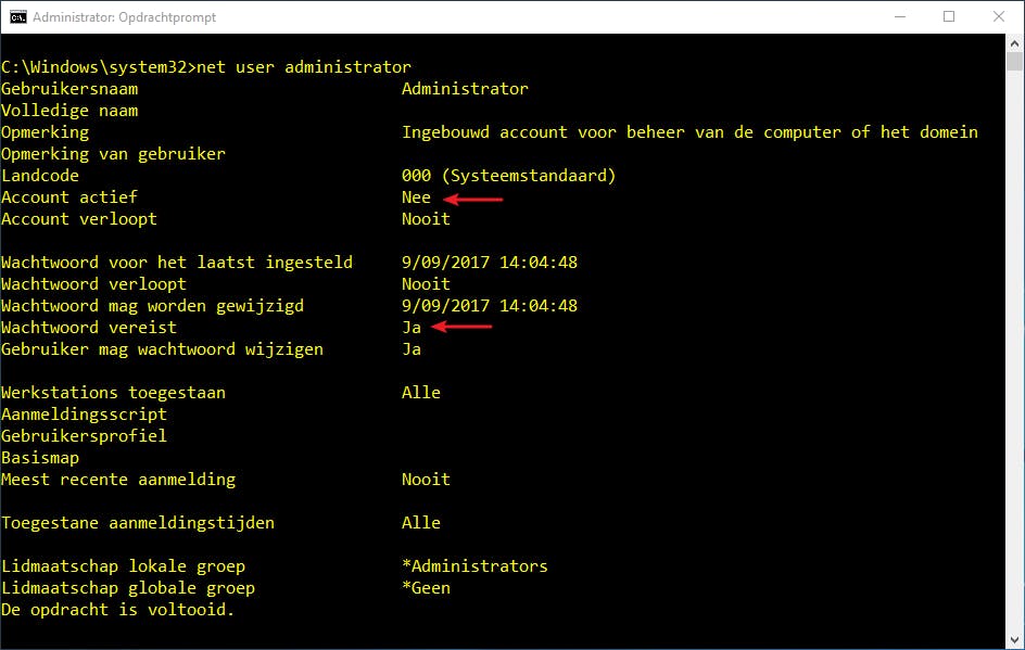 Goed om weten: in Windows 10 zit ook een verborgen administratoraccount ingebouwd, met de naam Administrator. Dit account voorzie je veiligheidshalve het best ook van een sterk wachtwoord, ook al is dit account standaard niet actief. Dat doe je door de opdrachtprompt als administrator te openen en het commando net user Administrator
