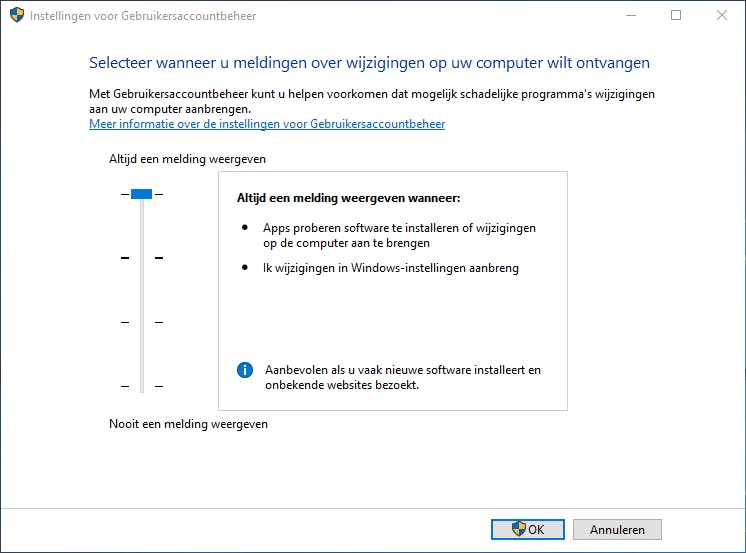 Zelfs wanneer je je als administrator aanmeldt, beschik je in niet zomaar over alle rechten: probeer maar even een document in een map als \Windows of \Program Files te bewaren. Om dat te doen moet je voor die applicatie bewust Als administrator uitvoeren hebben gekozen en dat kan in principe alleen maar als je de vraag Wilt u toestaan dat deze app wijzigingen aan uw apparaat aanbrengt bevestigend beantwoordt. Achter deze beveiliging schuilt het gebruikersaccountbeheer (uac) van Windows. Deze functie beheer je als volgt: open het Configuratiescherm en selecteer Gebruikersaccounts / Gebruikersaccounts / Instellingen voor Gebruikersaccountbeheer wijzigen. Standaard staat deze beveiliging ingesteld op het tweede hoogste niveau. Op zich kan dat volstaan, maar idealiter zet je de schuifknop helemaal bovenaan – tenminste zolang je je niet al te veel stoort aan de (nu frequenter optredende) meldingen van het gebruikersaccountbeheer. Zet deze functie in elk geval niet uit!