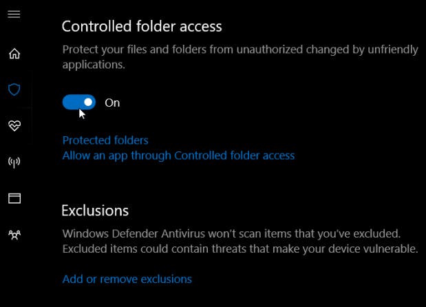 In oktober bracht Microsoft de Windows 10 Fall Creators Update uit. Die introduceert een interessante extra beveiliging tegen ongein als ransomware, genaamd ‘Controlled folder access’. Je kunt deze functie als volgt bereiken: open het beveiligingscentrum van Windows-Defender, kies Virus- en bedreigingsbeveiliging / Instellingen voor virus- en bedreigingsbeveiliging. Onderaan in dit venster hoor je de betreffende optie terug te vinden. Nadat je die hebt ingeschakeld is het mogelijk ook eigen mappen aan de bescherming toe te voegen: je kunt dan aangeven welke apps schrijfmachtigingen krijgen op die mappen. Probeert een ongeautoriseerde toepassing de inhoud van zo’n beschermde map te wijzigen, dan krijg je daarvan een melding.