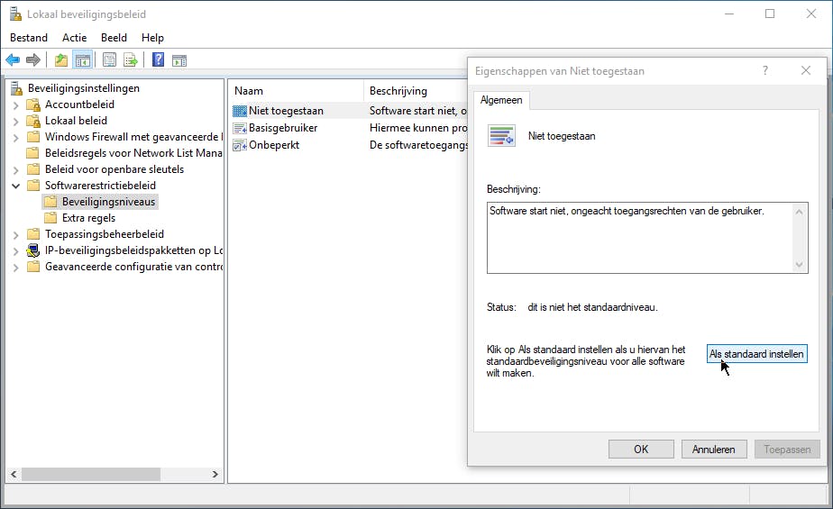 Nu is het de beurt aan het item Beveiligingsniveaus. Om de hoogst mogelijke beveiliging te activeren dubbelklik je hier op Niet toegestaan en druk je op de knop Als standaard instellen. Bevestig je keuze tot slot.