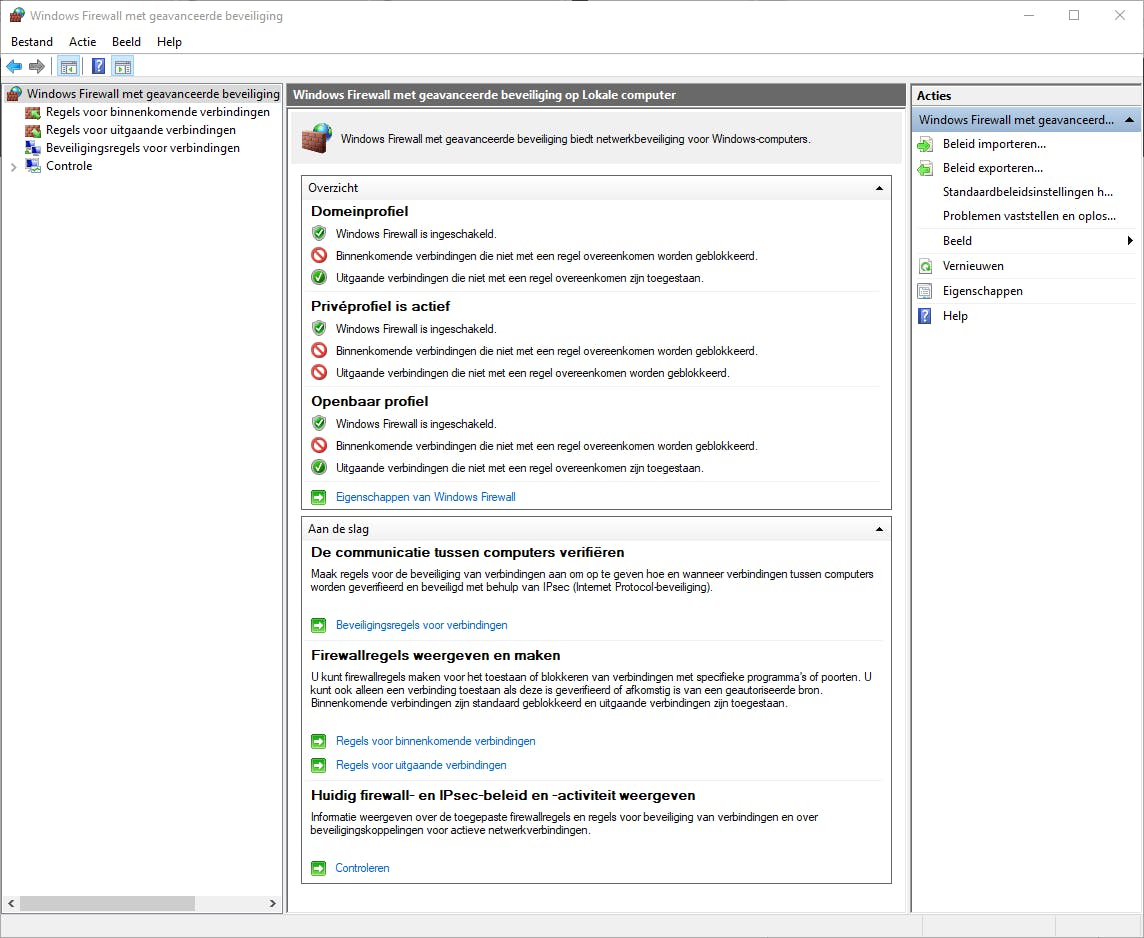 Meer nog dan het uitschakelen van overtollige services is een firewall een absoluut aangewezen instrument om je systeem tegen ongewenst verkeer te beveiligen. Voor de meeste gebruikers voldoet de in Windows ingebouwde firewall prima. Standaard blokkeert die firewall al het binnenkomende verkeer, althans tot je bijvoorbeeld via een pop-upvenster aangeeft dat je het verkeer voor een specifieke applicatie wilt toelaten. Al het uitgaande verkeer daarentegen wordt door de firewall standaard zonder meer doorgelaten. Dat is geen ideale situatie, maar het vereist wel wat technische kennis als je ook dat verkeer wilt blokkeren om vervolgens de nodige uitzonderingsregels te definiëren. Dat laatste gebeurt dan via Windows Firewall met geavanceerde beveiliging. Je vindt die door de Windows-startknop in te drukken en firewall in te tikken.