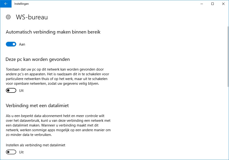Kun je deze opties missen, dan doe je er beter aan om het netwerk als een openbaar netwerk aan te duiden. Windows gaat er dan immers van uit dat je je op een openbare plaats bevindt (zoals een hotspot) en schroeft automatisch de beveiliging op, inclusief de firewall-instellingen. Wil je in Windows 10 van een particulier netwerk overschakelen naar een openbaar netwerk, ga dan naar Instellingen en kies Netwerk en internet. Beschik je over een bekabelde verbinding, klik dan achtereenvolgens op Ethernet en op de naam van je netwerk, waarna je de optie Deze pc kan worden gevonden op Uit zet (door die op Aan te zetten is het een particulier netwerk). Bij een draadloze verbinding klik je bij Netwerk en internet op Wi-Fi en selecteer je Bekende netwerken beheren. Vervolgens klik je op de netwerknaam en kies je Eigenschappen, waarna je ook hier Deze pc kan worden gevonden instelt op Uit.