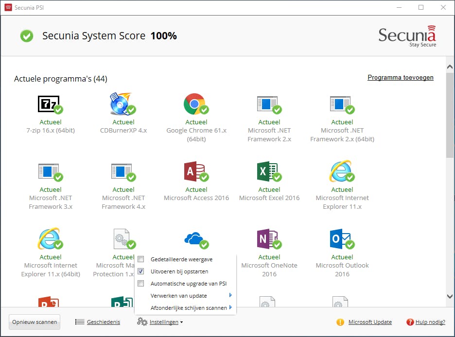 Heel vaak trachten malware en hackers je systeem binnen te dringen door gebruik te maken van ‘exploits’: kwetsbaarheden in Windows of andere software. Daarom doe je er verstandig aan al je software zo goed mogelijk up-to-date te houden. Dat geldt zéker voor software die wel vaker belaagd wordt, zoals browsers, Adobe Reader, Adobe Flash en Java. Intussen is het wel zo dat Windows zichzelf grotendeels up-to-date houdt en dat het de gebruiker lastig wordt gemaakt om die automatische updates tegen te houden. Je zult begrijpen dat we in een artikel rond het beveiligen van Windows niet verder ingaan op technieken om deze updates te blokkeren. Meer zelfs: we raden je tevens aan een (gratis) programma als Secunia Personal Software Inspector te installeren, inmiddels overgenomen door Flexera. Deze tool checkt heel wat geïnstalleerde programma’s (van derden) en zal die waar mogelijk van de recentste patches voorzien. Tijdens de installatie kun je aangeven wat er met de gevonden updates moet gebeuren: automatisch downloaden, meteen ook bijwerken of je zelf laten kiezen of je updates downloadt. De tool blijft actief op de achtergrond en controleert regelmatig op nieuwe updates.