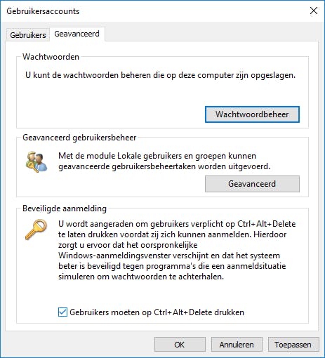 Om trojans die het Windows-aanmeldscherm nabootsen (om zo je inlogwachtwoord te bemachtigen) de pas af te snijden, activeer je best de Beveiligde aanmelding. Die vind je door Windows-toets+R in te drukken, het commando netplwiz uit te voeren en op het tabblad Geavanceerd een vinkje te plaatsen bij Gebruikers moeten op Ctrl+Alt+Delete drukken. Je doet er bovendien goed aan een schermbeveiliging met wachtwoord te activeren zodra je pakweg tien minuten niets met het systeem doet, bijvoorbeeld omdat je even pauzeert. Dat regel je via Instellingen / Persoonlijke instellingen / Vergrendelingsscherm / Instellingen voor schermbeveiliging. Plaats hier tevens een vinkje bij Aanmeldingsscherm weergeven bij hervatten.
