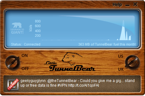 TunnelBear werkt kinderlijk eenvoudig met een aan/uit-knop en een landkeuze-schakelaar.