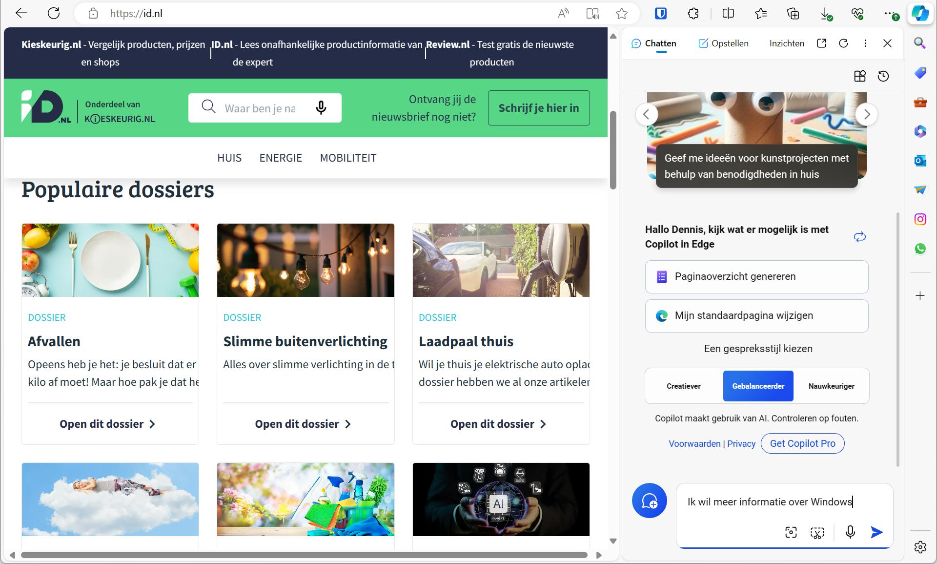 Open de browser, klik op de Copilot-knop rechtsboven in beeld of gebruik de toetscombinatie Ctrl+Shift+. (punt). Het deelvenster opent rechts. Bovenin vind je drie tabbladen: Chatten, Opstellen en Inzichten. Op de eerste tab ga je conversaties met Copilot aan. Zo typ je in het vak onderin de gewenste prompt, zoals een vraag of een opdracht. De tab Opstellen helpt je bij het maken van een bericht, zoals brief, e-mail of blog. De tab Inzichten geeft informatie over je online (zoek)gedrag, zoals zoektermen en een analyse van de website die je bezoekt.