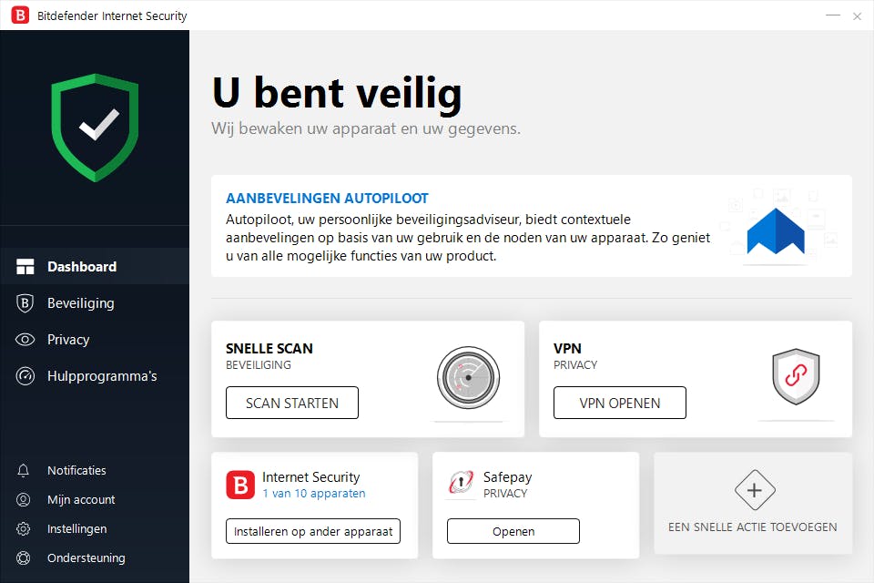 Bitdefender biedt beveiliging in drie pakketten: Antivirus Plus, Internet Security en Total Security. De eerste is een (zeker ook in vergelijking tot andere antivirus-producten) zeer uitgebreide bescherming tegen malware en botnets, met extra’s zoals een wachtwoordmanager, een bestandsvernietiger, webbeveiliging, wifi-bewaking, anti-phishing en een beschermde browser voor veilig bankieren. Alle Bitdefender-producten hebben het nieuwe Dashboard, dat direct de status van de beveiliging van de pc laat zien en nu ook adviezen geeft om de bescherming nog verder te verbeteren. Dit Dashboard kan bovendien naar eigen voorkeur worden aangepast door onderdelen weg te laten of juist toe te voegen. Jammer is wel dat de Bitdefender-vensters een vaste grootte hebben, wat de bruikbaarheid beperkt.