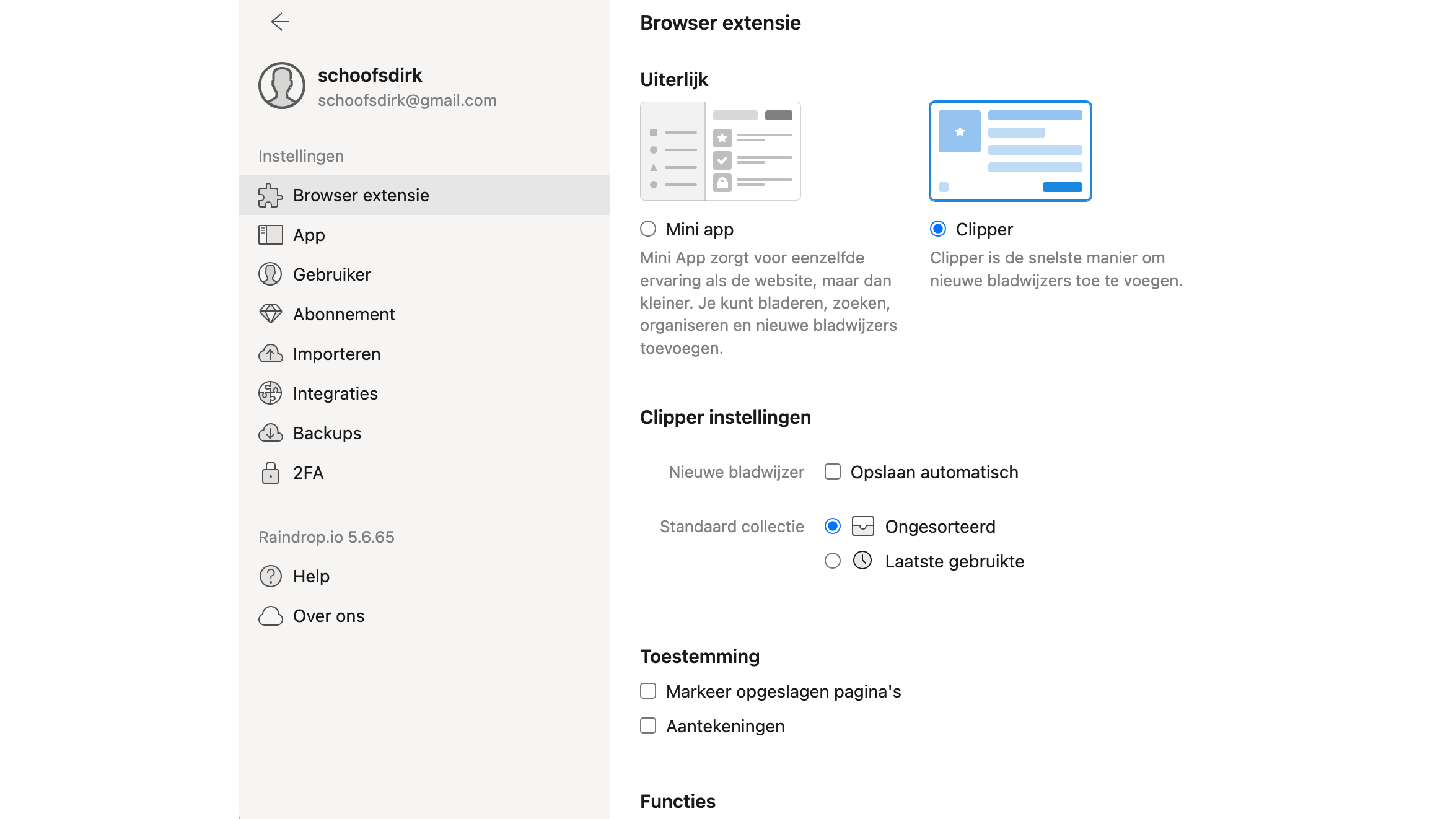 Raindrop heeft extensies voor de gangbare browsers, zodat je met één muisklik vanuit de browser de tool aanspreekt. Als je de extensie installeert, kun je kiezen wat er gebeurt als je op het pictogram klikt. Wil je een miniversie van Raindrop openen? Of kies je voor de optie Clipper waarmee je direct de pagina vastlegt?