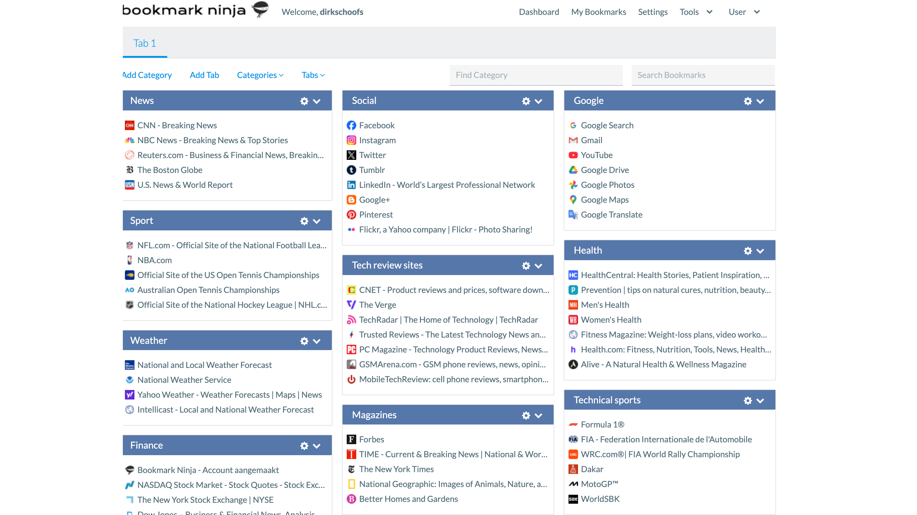 Bookmark Ninja bekijk je in twee verschillende weergaven. Met de modus Dashboard krijg je een strak georganiseerde weergave met tabbladen en categorievakken. Je kunt de lay-out aanpassen naar drie, vier of vijf kolommen. Het is mogelijk om bladwijzers van het ene vak naar het andere slepen. Je beschikt verder over verschillende sorteer- en zoekhulpmiddelen.