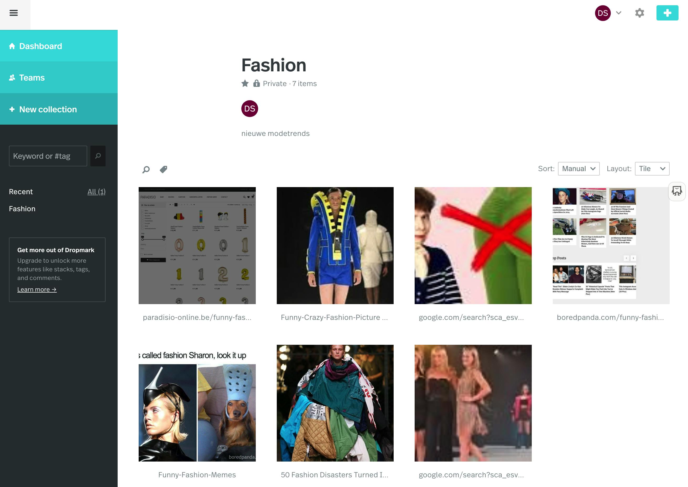 Je organiseert het materiaal in collecties die je eenvoudig deelt. Daarnaast heeft Dropmark een prima zoekmachine. Leuk extraatje: je kun je collectie afspelen als slideshow. Je mag Dropmark gratis gebruiken. Voor meer mogelijkheden zijn er ook een Solo-abonnement voor bijna 4 euro per maand, en een Team-versie voor ongeveer 5 euro per maand.