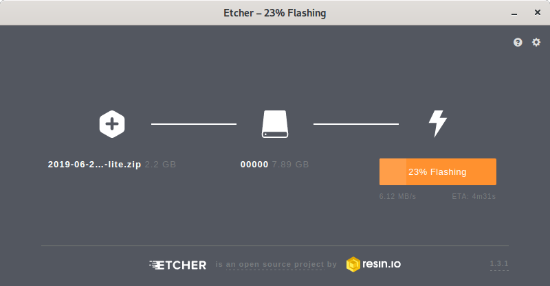 Download dan het programma balenaEtcher, start het op, selecteer het zipbestand van Raspbian Buster Lite en selecteer de schijfletter van je micro-sd-kaart. Klik op Flash! om het schrijven te beginnen. Wanneer dit voltooid is, haal je het micro-sd-kaartje uit de kaartlezer en steek je het er weer in.