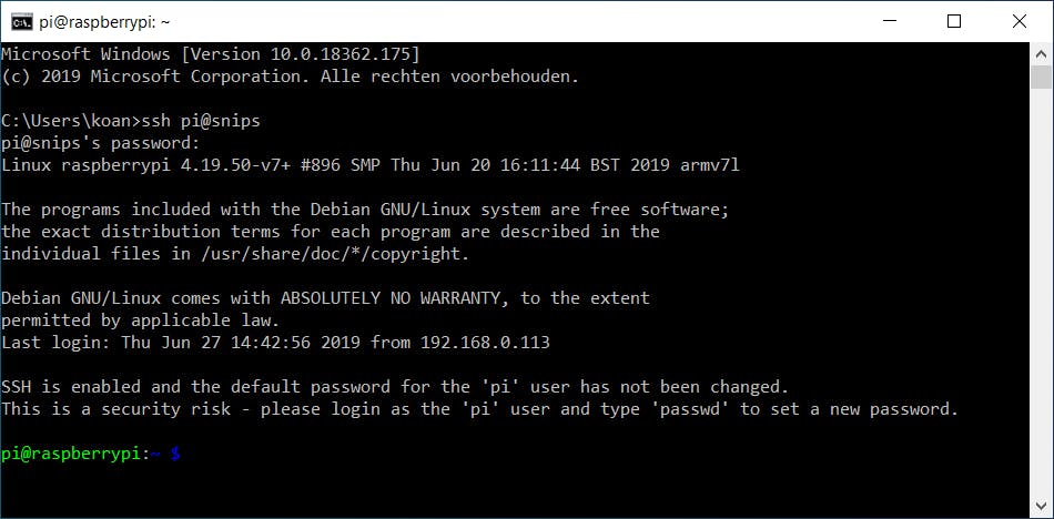 Daarna kun je in de opdrachtprompt van Windows op je Raspberry Pi inloggen met de opdracht ssh pi@IP, met in plaats van IP het daadwerkelijke ip-adres van je Pi. Bevestig met yes dat je de vingerafdruk vertrouwt en vul het wachtwoord raspberry in. In macOS en Linux is de ssh-client overigens standaard al geïnstalleerd, dus in die besturingssystemen kun je onmiddellijk aan de slag. Verander zodra je ingelogd bent het wachtwoord van de gebruiker pi met de opdracht raspi-config en dan de optie 1 Change User Password.