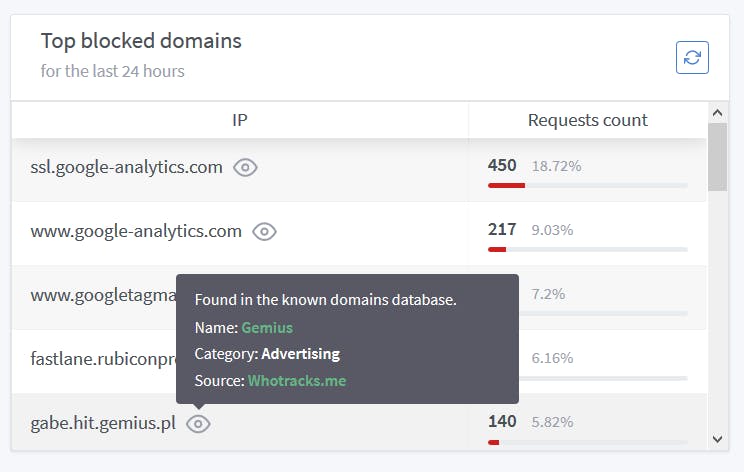Vooral de lijst met de meest geblokkeerde domeinen is interessant. Achter de meeste domeinen zie je een icoontje van een oog. Blijf je daar met je muis over hangen, dan krijg je wat informatie over waarom dit domein geblokkeerd is: wat is de naam van de eigenaar van het domein, gaat het om een domein voor advertenties of site analytics, enzovoort. Er staat ook een link bij naar WhoTracks.me met meer informatie over het domein.