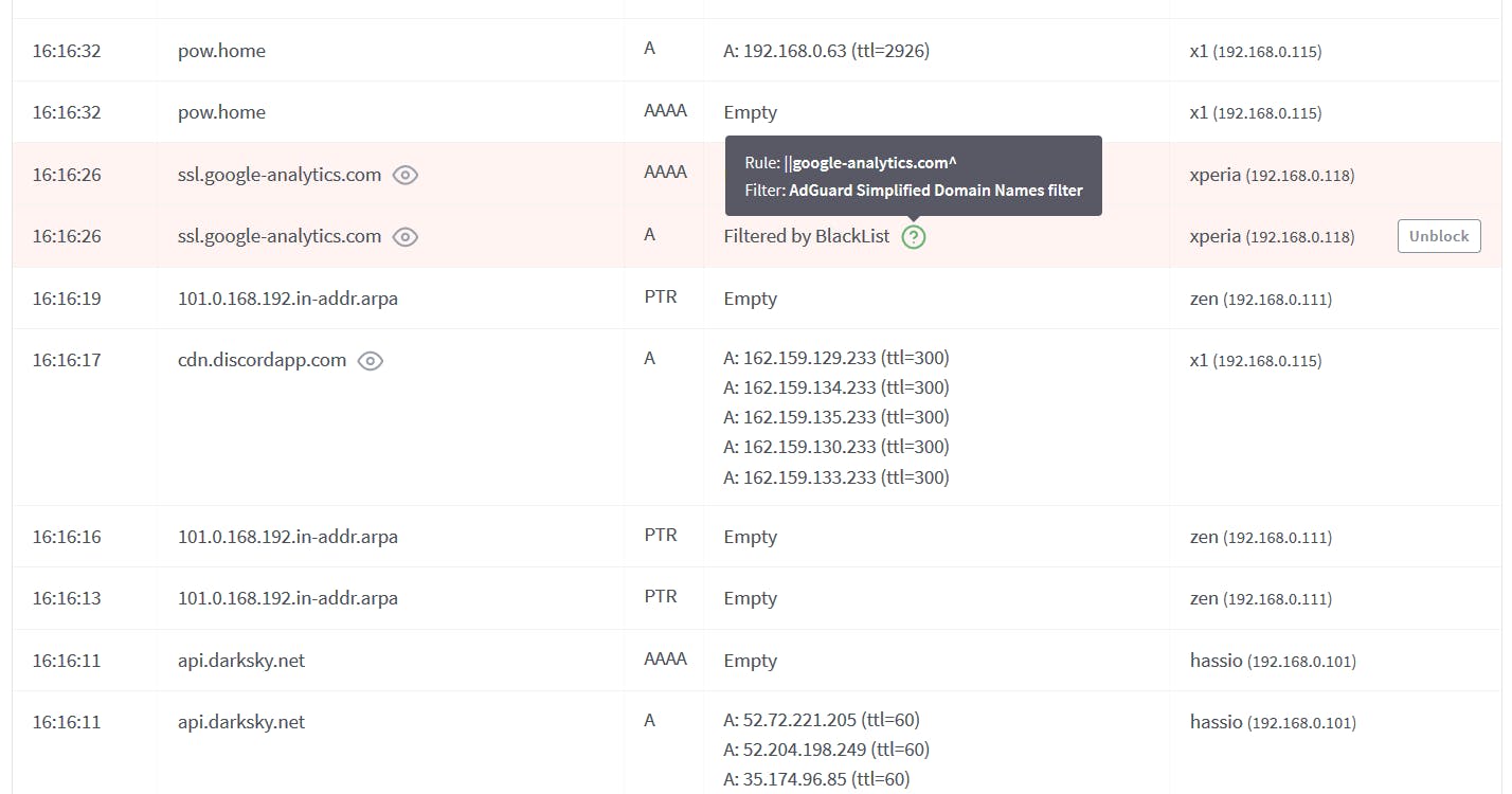 Zie je een domein voorbijkomen dat je wilt blokkeren, blijf dan met je muiscursor boven de rij hangen en klik rechts op het knopje Block. Als een van je toestellen daarna nog eens het domein opvraagt, zie je in het logboek dat dit geblokkeerd wordt. Klik je dan op het vraagteken naast Filtered by Blacklist, dan krijg je de regel te zien die AdGuard Home toegevoegd heeft en zie je als filter Custom filtering rules. Bedenk je je over de blokkade, dan kun je altijd rechts op Unblock klikken om het domein weer toe te staan. Klik boven op Refresh als je de nieuwste dns-aanvragen wilt bekijken.