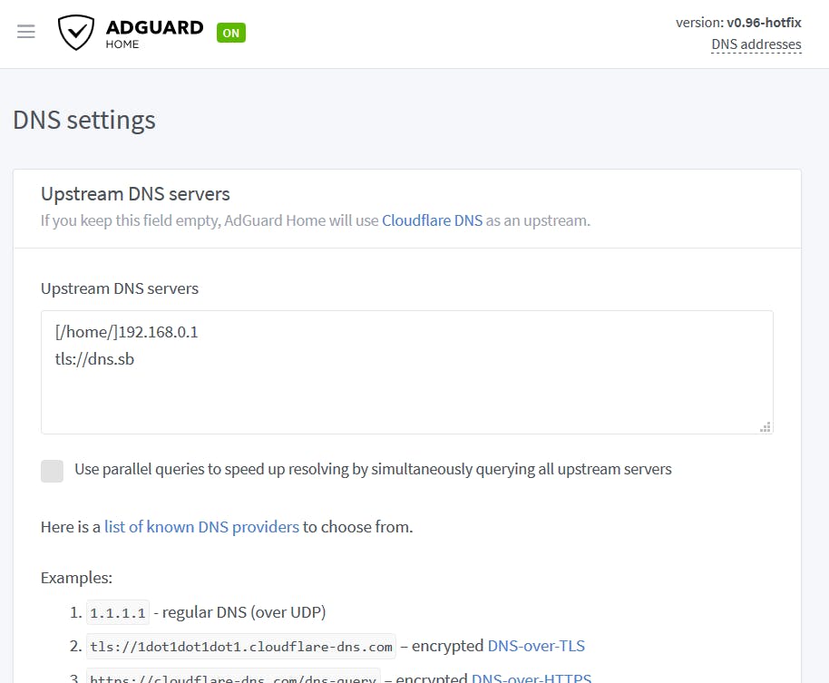 Je kunt hier overigens ook instellen dat AdGuard Home dns-aanvragen voor een specifiek domein naar een specifieke dns-server doorstuurt. Dat is nuttig als je de hostnames uit het domein van je lan door de interne dns-server van je router wilt laten verwerken. Heeft je lan bijvoorbeeld als domein home en heeft je router het ip-adres 192.168.0.1, dan vul je de regel [/home/]192.168.0.1 in.