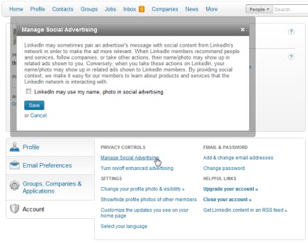 Eind juni kondigde LinkedIn op zijn eigen weblog aan de privacyvoorwaarden te wijzigen op het gebied van 'hoe acties van gebruikers met anderen gedeeld worden'. Uw profielfoto en -naam kunnen bij een advertentie geplaatst worden, zogezegd om de advertenties te personaliseren. Wilt u dit niet? Dan moet u het zelf uitzetten. Ga naar www.linkedin.com en log in met uw gegevens. Klik op uw gebruikersnaam rechtsboven en kies Settings. Het kan zijn dan LinkedIn opnieuw om uw e-mailadres en wachtwoord vraagt, voer deze gegevens dan in. Klik op Account en vervolgens bij Privacy Controls op Manage Social Advertising. Zorg dat u het vinkje hier weghaalt en klik op Save. Nu mag LinkedIn uw naam en profielfoto niet meer gebruiken in advertenties.