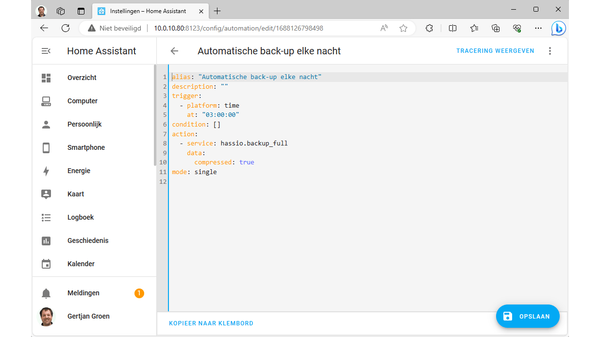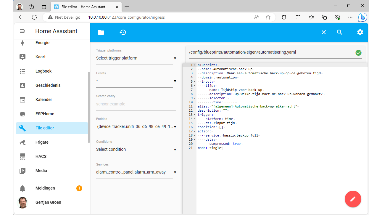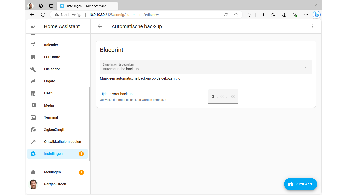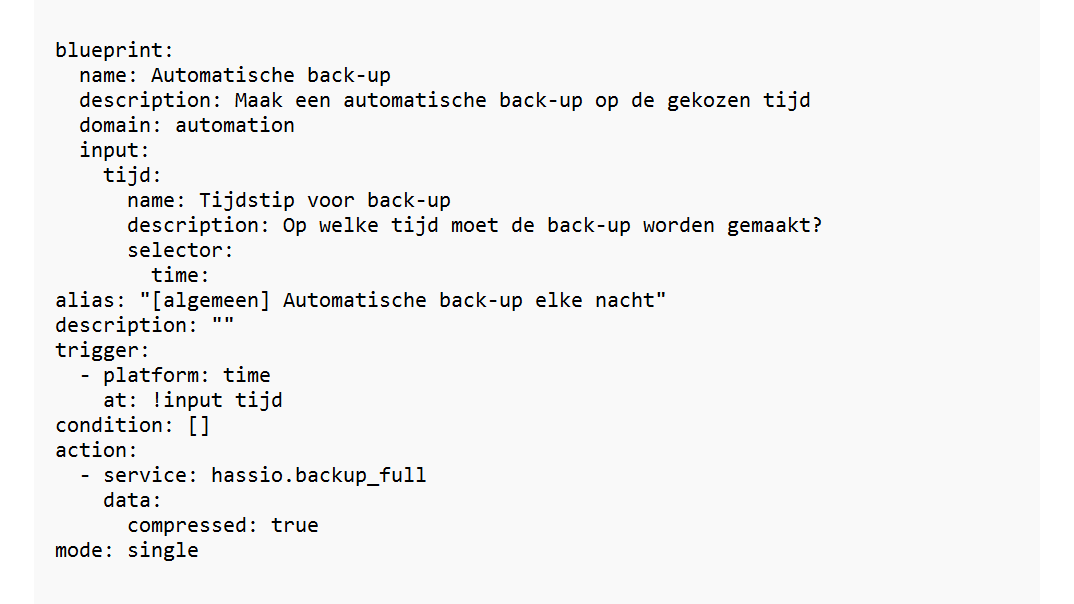 Het onderstaande voorbeeld is een blueprint voor een automatische dagelijkse back-up waarin alleen om een tijdstip voor de back-up wordt gevraagd met !input tijd. Bij de metagegevens stellen we bij selector: in dat in het veld om een tijdstip wordt gevraagd.