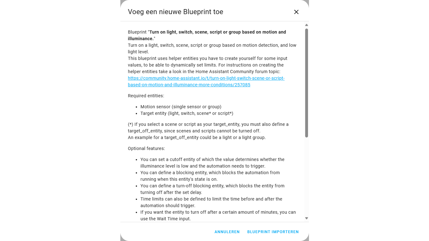Het topic zelf geeft een beschrijving van de blueprint en reacties van gebruikers. Vanuit het overzicht met blueprints kun je nu een nieuwe automatisering met die blueprint maken. Ook als je een nieuwe automatisering toevoegt, kun je een blueprint als basis gebruiken en die uiteraard meerdere keren gebruiken. Vaak bouw je daarom een verzameling op met blueprints die je handig vindt.