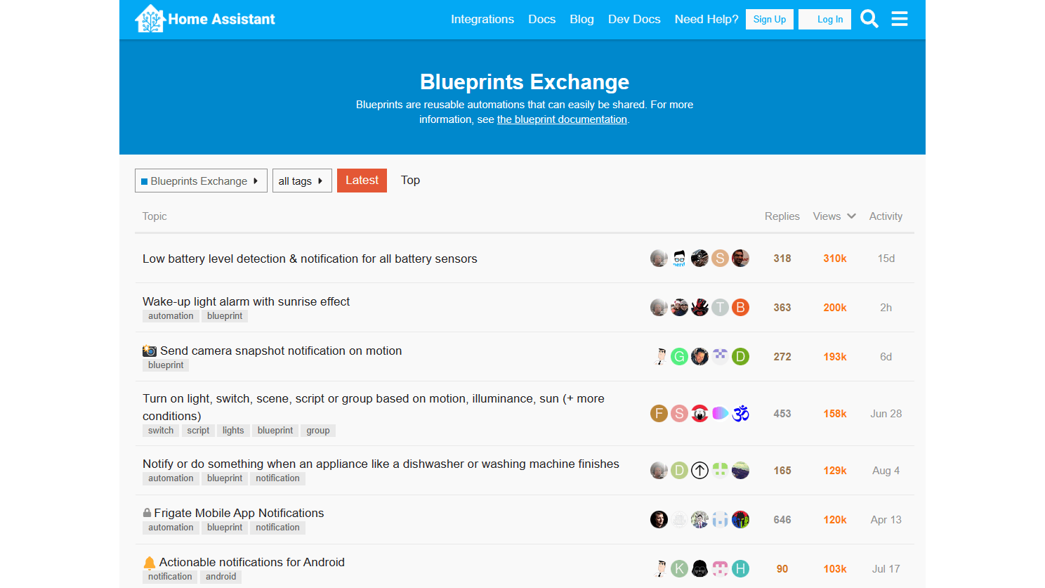 Je kunt ook nieuwe blueprints importeren. Een handig startpunt om deze te vinden, is het Home Assistant-forum. Om de populairste te zien, kun je sorteren op het aantal weergaven.