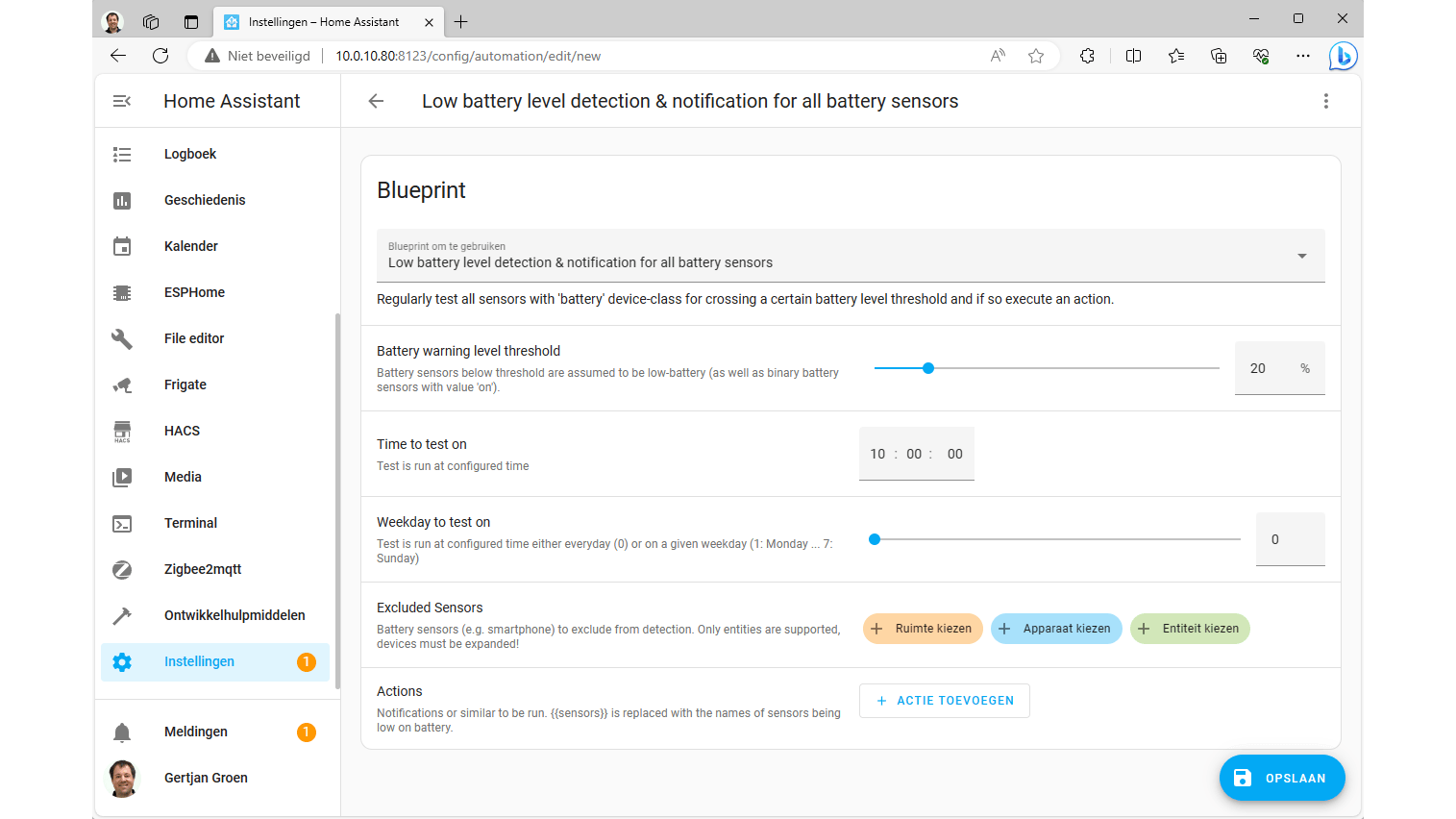Handige ingebouwde blueprints Home Assistant kent enkele handige ingebouwde blueprints, we geven wat voorbeelden: * Voor het controleren van alle accu’s en batterijen in apparaten: er wordt een waarschuwing gegeven als een batterij bijna leeg is. Je hoeft alleen enkele uitzonderingen op te geven met apparaten waarvoor geen waarschuwing nodig is, bijvoorbeeld je smartphone. * Voor het versturen van een notificatie naar een smartphone: dit script kun je vanuit elke automatisering aanroepen. De notificatie kun je voorzien van knoppen voor bevestigen en afwijzen. Bij deze blueprint hoef je alleen de smartphone te selecteren, een titel en bericht in te voeren, en acties voor bevestigen en afwijzen te kiezen. * Om een lamp aan te zetten bij beweging: kies hoelang de lamp moet blijven branden na de laatste detectie. * Om een notificatie naar een toestel te sturen als een bepaalde persoon een bepaalde zone verlaat. Gebruik het bijvoorbeeld om te weten wanneer je partner van zijn of haar werk vertrekt.