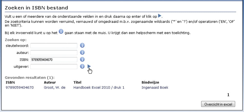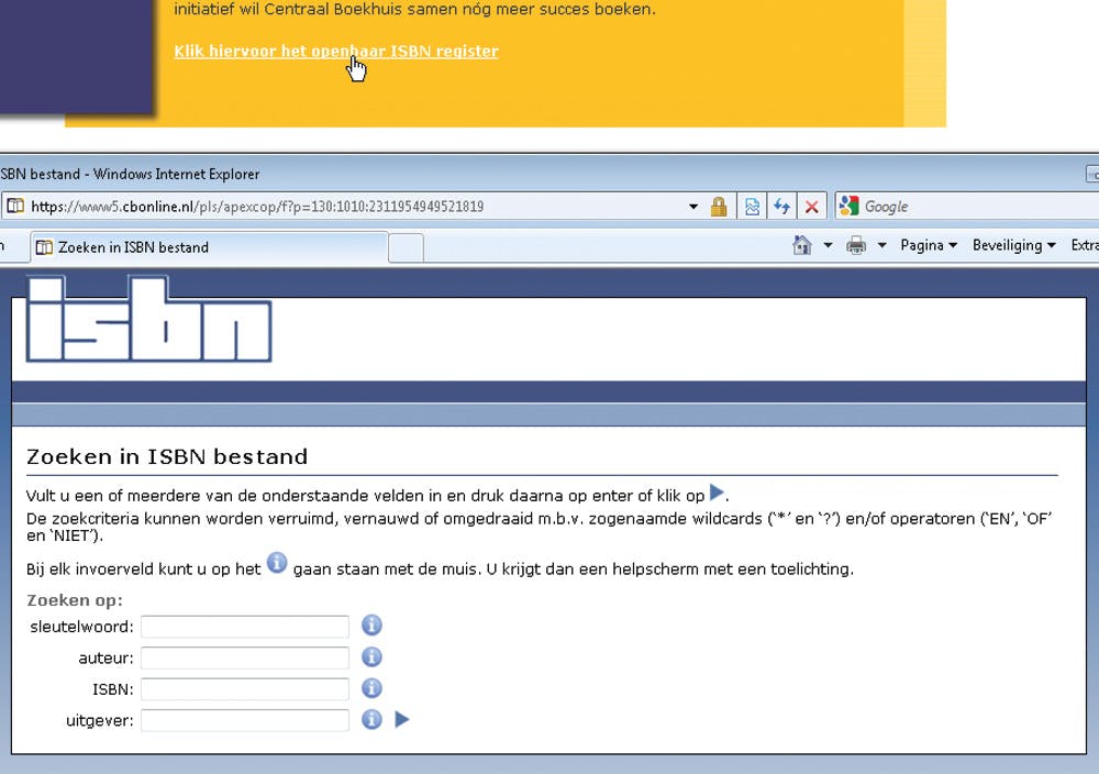 Ieder boek heeft een uniek nummer, het ISBN ofwel het Internationaal Standaard Boek Nummer. Zodra een boek wordt uitgegeven, wordt dat aangemeld bij het bureau ISBN, dat een nummer toekent. Dit bureau beschikt over een uitgebreid register met gegevens van Nederlandse en Vlaamse publicaties. Lange tijd waren de ISBN’s het monopolie van het Centraal Boekhuis. Na druk uit de auteurswereld is dit register in december 2008 openbaar toegankelijk gemaakt. Op de website www.isbn.nl vindt u achtergrondinformatie over het ISBN. Helemaal onder in beeld klikt u op Klik hiervoor het openbaar ISBN register (u ziet: ze houden het nog steeds een beetje geheim). U komt dan in een venster (zie afbeelding) waarin u boeken kunt opzoeken aan de hand van een sleutelwoord, de auteur, de uitgever en jawel: het ISBN. Na het invullen van het ISBN verschijnen de titel en de andere gegevens van het boek. Dat gebruiken we in dit artikel. U vindt dit venster meteen als u surft naar https://www5.cbonline.nl/pls/apexcop/f?p=130.