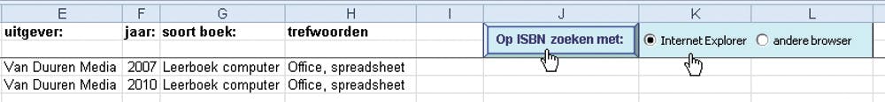 Maar goed, wij houden het hier bij Nederlandstalige boeken. Als u het bestand CID ISBN-zoeker.xls even van onze website ophaalt, krijgt u een (lege) lijst om uw boeken bij te houden. Wij hebben rechtsboven in dat werkblad de lichtblauwe knop ‘ISBN zoeken met:’ ingebouwd, waarmee u rechtstreeks naar de eerder genoemde website surft. Daarnaast vindt u twee keuzerondjes, daarmee kiest u eerst met welk programma u naar internet gaat: met Internet Explorer van Microsoft of met een andere browser. Dan klikt u op de knop ‘ISBN zoeken met:’ en even later hebt u het genoemde venster Zoeken in ISBN bestand in beeld (zie afbeelding).